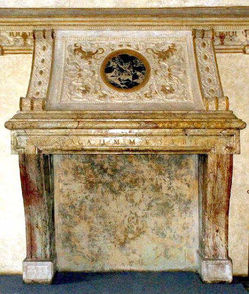 Il camino ha una struttura in pietra chiara di Verona, la cappa in stucco modellato con doppie volute, decorata a girali vegetali con l'impresa del ramarro e putti con cartiglio. Al centro della cappa si trova un tondo in marmo nero screziato di bianco inquadrato da una cornice in stucco.
