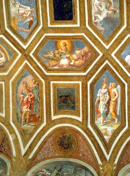 L'intersezione di ottagoni dai lati diseguali genera losanghe ottagonali e specchiature rettangolari. Gli affreschi sono associati a stucchi dipinti a finto bronzo. L'intonazione scura dei rilievi contrasta con le cornici dorate e i colori vivaci dei dipinti, dai fondali in prevalenza blu e verdi. Al centro è modellata l'impresa del monte Olimpo. Nella fascia centrale si dispongono dodici divinità olimpiche, affrescate o modellate a stucco. Intorno si alternano bassorilievi con i segni dello Zodiaco e dipinti con le personificazioni dei mesi. Le unghie della volta sono decorate da grottesche su fondo rosso cupo. Al centro di ogni spazio s'incrive un tondo con la testa di un vento che soffia.