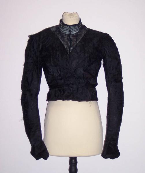 Corpetto in raso damascato di seta nero; allacciatura anteriore; inserti in velo con fiocco nella parte anteriore.