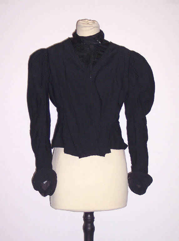 Casacca in cotone nero con inserti in raso damascato nero nella parte anteriore; interno in panno; allacciatura anteriore con bottoncini.