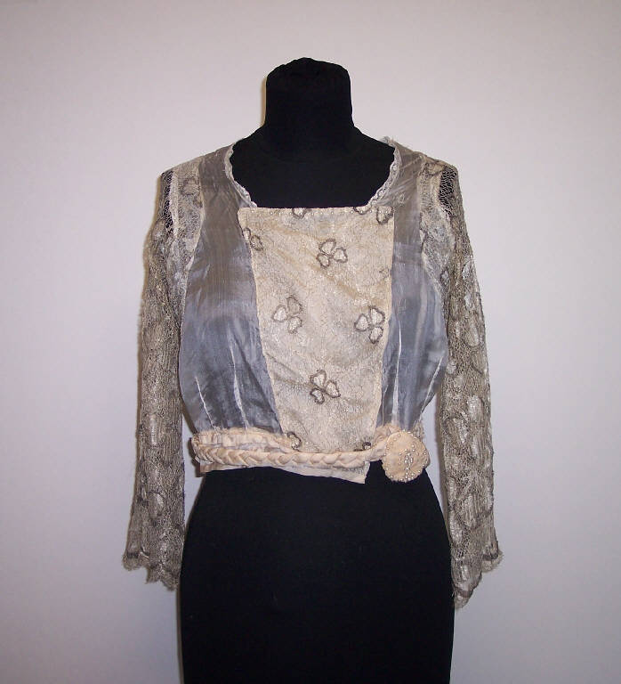 Corpetto in seta bianca; maniche a 3/4 in filet ricamato con motivi floreali; inserto in seta gialla rivestito dello stesso filet ricamato nella parte anteriore; treccia di seta gialla applicata al girovita; allacciatura anteriore.