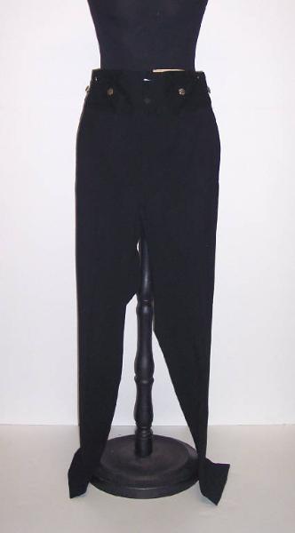 Pantaloni, parte del completo da sposo, in panno di lana nero foderato in cotone giallo a righe sottili come qullo del gilet; fettuccia cucita internamente con cifre rosse "CR".