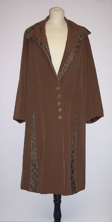 Soprabito in seta pesante marrone; manica lunga; collo a scialle con profonda scollatura; allacciatura con cinque bottoni; passamaneria applicata al collo, ai polsini e nella parte della gonna; fodera in seta operata marrone scuro.