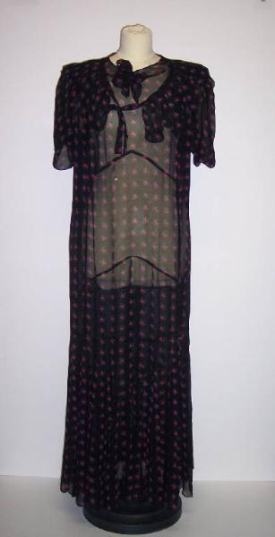 Abito in chiffon di seta con motivi floreali su fondo nero; manica corta con lieve sbuffo sulla spalla; colletto staccato rifinito a cappe dello stesso tessuto e colore dell'abito.