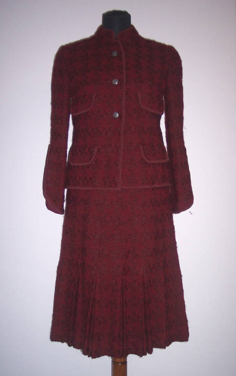 Completo femminile composto da giacca, gilet e gonna in lana bordeaux.