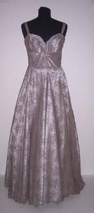 Abito in raso di seta grigio-argento rivestito con pizzo grigio perla decorato con motivi floreali; allacciatura anteriore con gancetti; spallini sottili; gonna ampia; punto vita alto; corpino con stecche interne.