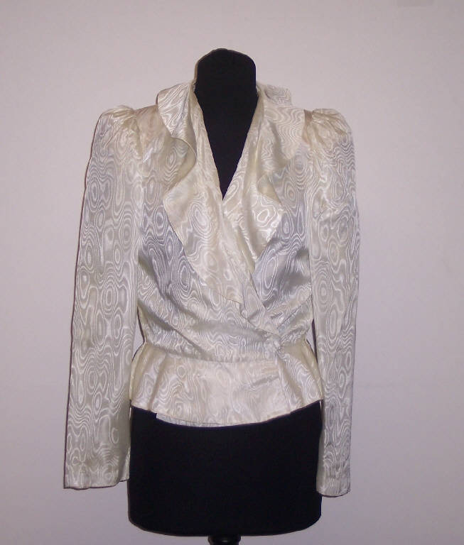 Giacca, parte del completo da sposa, in moiré di seta color avorio foderata in seta; manica lunga; chiusura anteriore incrociata; baschina al girovita.
