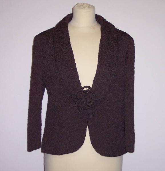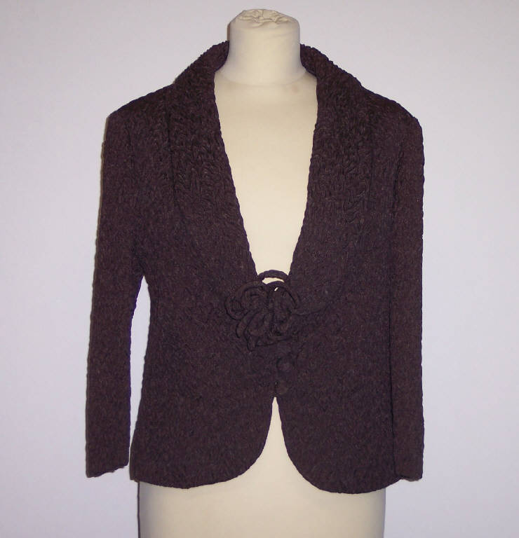Giacca, parte del completo, in matelasse marrone; manica lunga; allacciatura con quattro bottoni rivestiti dello stesso tessuto dell'abito, come il motivo decorativo che fa da chiusura sul primo bottone.
