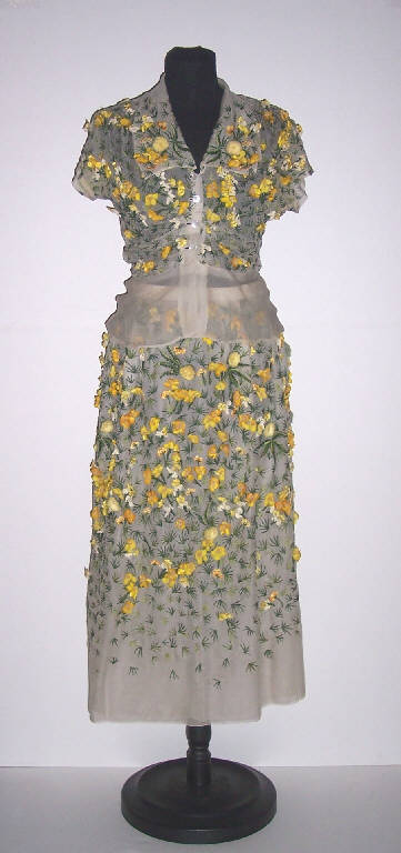 Completo, composto da gonna e casacca, in organza di seta color écru ricamata ad ago con applicazioni di fiori a rilievo di color giallo su tutta la superficie; maniche corte; allacciatura anteriore con bottoni; fodera in organza color écru.