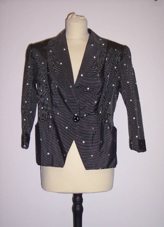 Giacca, parte del completo, in seta nera con righe sottili e quadretti bianchi; maniche lunghe; allacciatura anteriore con un bottone.