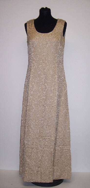 Abito lungo a tunica senza maniche in seta operata color beige; cordoncino della stessa tonalità, applicato su tutta la superficie; allacciatura posteriore con cerniera.