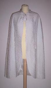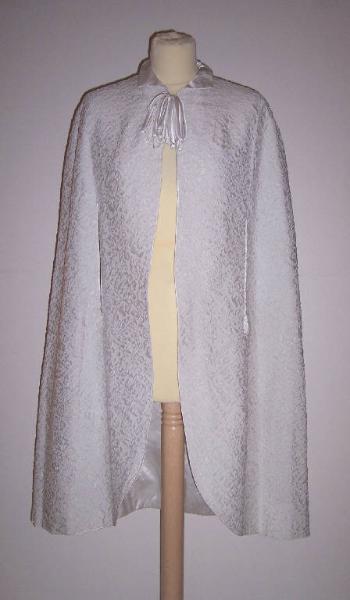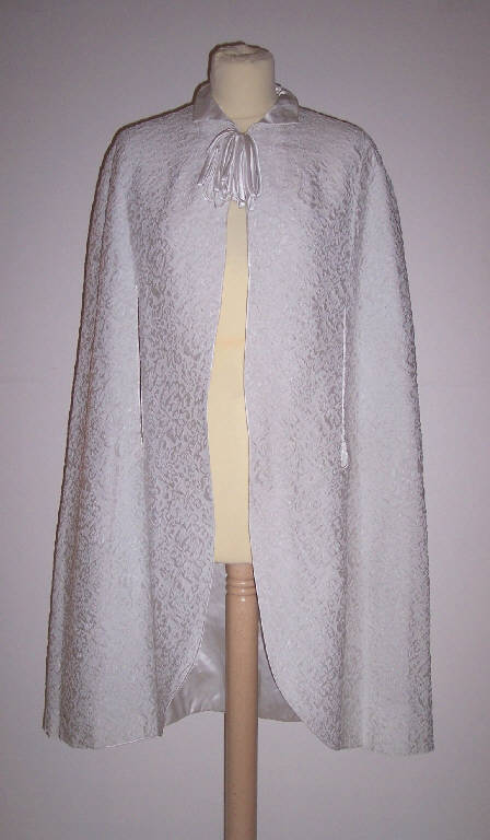 Mantellina, parte del completo da sposa, in seta operata bianca foderata con raso di seta bianco; due tagli longitudinali nella parte anteriore per la fuoriuscita delle braccia; fiocco applicato alla chiusura del colletto.