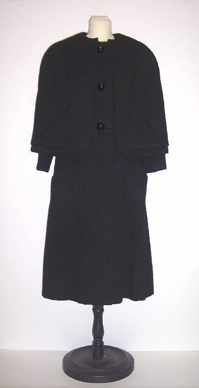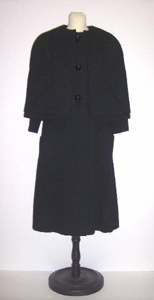 Completo composto da cappotto e mantellina in panno di lana nero.