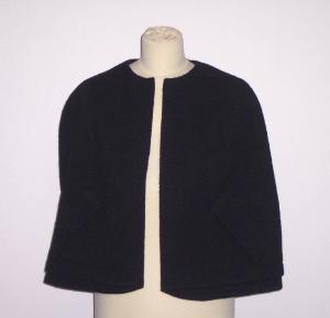 Mantellina, abbinata al cappotto, in panno di lana nero; collo rotondo; fodera di seta nera; due tagli longitudinali per la fuoriuscita delle braccia.