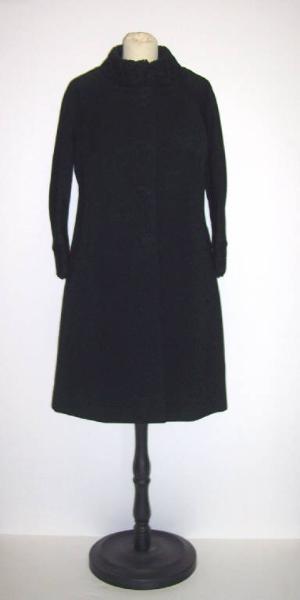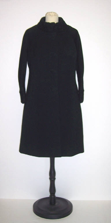 Cappotto in panno di lana nero; fettucce nere applicate a collo e polsini; quattro bottoni decorati con le stesse fettucce; fodera di seta nera.