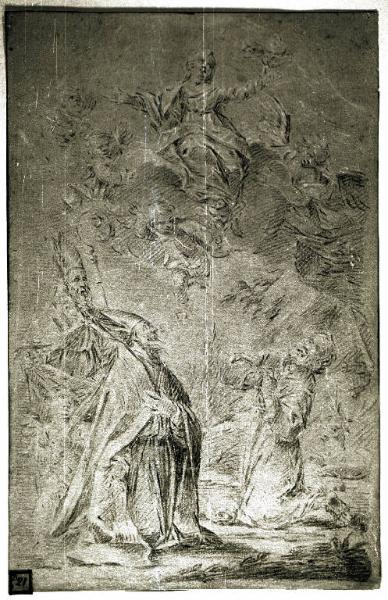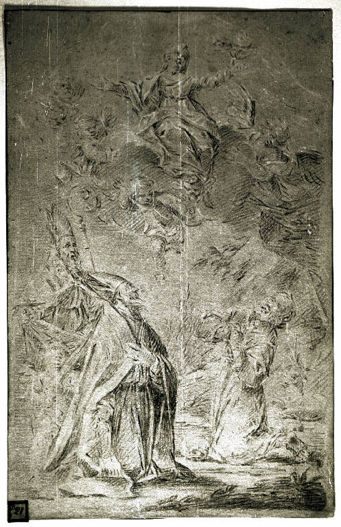 Madonna in gloria, due santi vescovi e un santo