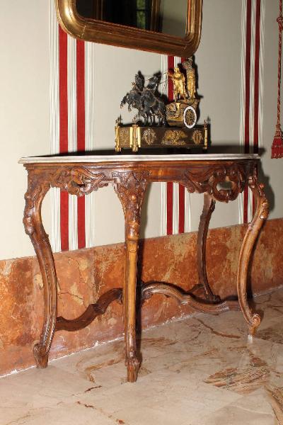 Consolle in legno con esili gambe sagomate su piedi a volute e decori a racemi, perle e volute scolpite, piano in marmo bianco.