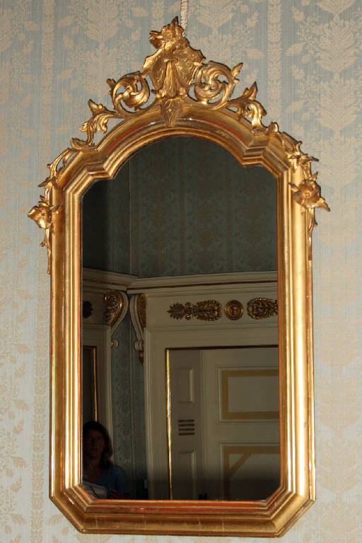Specchiera rettagolare trilobata nella parte alta, con scudo centrale, volute e fiori ai lati.