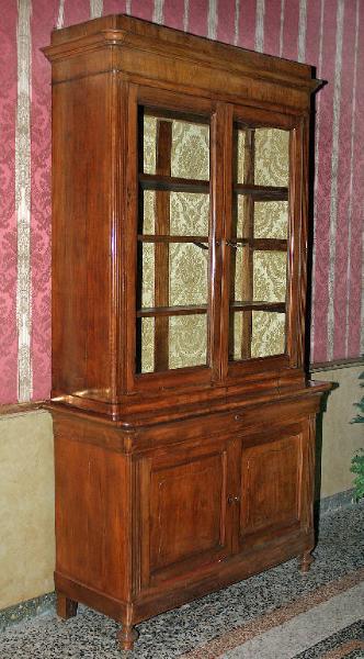 Mobile libreria a due ante in vetro, piedi a cipolla, tre mensole interne, ai lati lesene scanalate. Le lesene scanalate continuano anche nella porzione bassa del mobile, caratterizzata da due piccole ante con formelle sagomate. L'interno è rivestito in damasco giallo.
