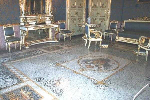 Pavimento seminato alla veneziana, bianco, nero, grigio, giallo, rosso. Al centro campeggia lo stemma della famiglia Malaspina di Sannazzaro, con aquila bicefala e corona. Ai quattro lati quadrato nero con corona e iniziali M.L.M, tutt'intorno fascia a nastro e fascia a rosette e racemi.