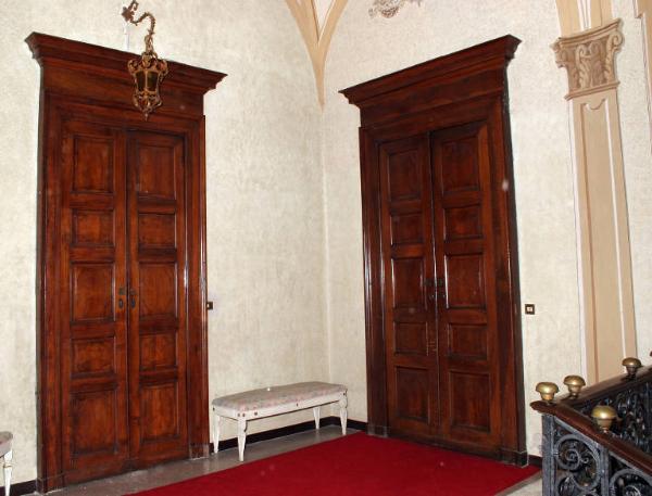 Sul pianerottolo dello scalone monumentale al primo piano, si aprono due porte d'accesso all'appartamento nobile. Sono in legno massiccio, a due battenti, ciascuno con 5 pannelli con lavorazione a taglio di diamante a disegnare forme poligonali. Il cappello è modanato. Ciascuna porta presenta due maniglie in ottone: una caratterizzata dalle iniziali LM (Luigi Malaspina) e una ad anello.