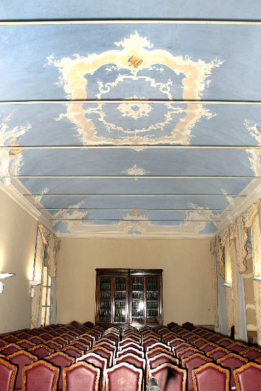 La grande sala al pian terreno nel corpo centrale dell'edificio, tra il cortile e il giardino, presenta nella volta una decorazione rococò con stucchi raffiguranti armi (moschetti con baionetta, spade, cannoni), strumenti musicali (flauti, tamburi, trombe) e putti , "forse a ricordare l'Accademia di Musica e d'arte militare che veniva radunata presso la sua casa dal marchese Ottaviano Malaspina negli anni 1678-1680" (cfr. L. Erba in BIB). Gli stucchi sono bianchi per quanto riguarda gli elementi decorativi a racemi, mentre sono colorati gli elementi figurativi. Gli stucchi campeggiano su uno sfondo azzurro.