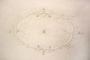 La stanza, al pian terreno, comunicante con la stanza adiacente alla grande Sala della Caccia, presenta nella volta a padiglione una decorazione rococò con stucchi bianchi, su fondo bianco, raffiguranti volute, foglie e motivi fitomorfi.