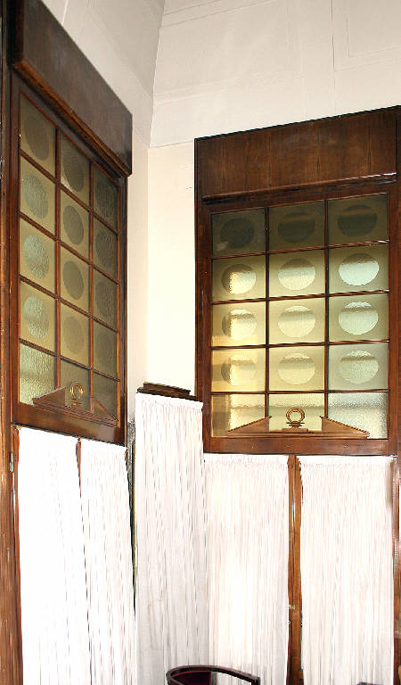 Le due porte-finestre si aprono su un balcone nelle pareti sud-est della torre che caratterizza l'edificio. Sono decorate da un timpano spezzato con clipeo centrale. Sono sormontate da vetrate con una griglia lignea che racchiude 15 riquadri in vetro satinato, ciascuno caratterizzato da un clipeo centrale. Tra le due porte-finestre si inserisce una semplce struttura che nasconde l'impianto di riscaldamento.