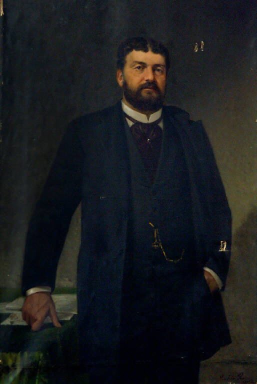 Ritratto d'uomo a tre quarti, vestito di scuro con catena che esce dal panciotto, la mano sinistra in una tasca e la destra appoggiata su di un tavolino, sul quale si scorgono alcuni fogli