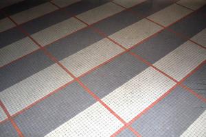 Pavimento a mosaico con tessere in ceramica grigia, bianca e rossa: composizione geometrica fatta di linee rosse verticali e orizzontali che si intersecano perpendicolarmente su un fondo a fasce bianche e grige.