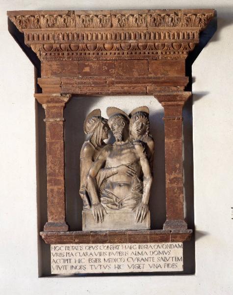 - NOTIZIE STORICO CRITICHE Il rilievo della Pietà, di altissima qualità e sicurezza formale, è un capolavoro che uguaglia le migliori opere di plastica della vicina Certosa. \nLa scultura, viene attribuita dalla critica ad Antonio Mantegazza, con qualche perplessità dovuta alla difficoltà di distinguere la sua mano da quella del fratello Cristoforo.\nPersonalità di grande fama nel XV secolo, Antonio e Cristoforo Mantegazza sono impegnati nella preziosa decorazione della facciata e dei chiostri della grande fucina artistica della Certosa, e nel 1473 sono anche chiamati ad elaborare la statua equestre di Francesco Sforza, poi progettata da Leonardo.\nIl gruppo scultoreo si staglia entro lo spazio esiguo della cornice, creando un contrasto cromatico tra i diversi materiali utilizzati, suggestiva la bicromia data dal rosso del cotto dell'incorniciatura architettonica e dal bianco del marmo delle tre figure del Compianto.\nI panneggi dalle pieghe quasi cartacee, i contorni netti e taglienti, i lineamenti vigorosi e possenti, le fisionomie tormentate e variate nelle posture dinamiche, che raggiungono un alto livello nell'accostamento tra la Vergine di profilo e il busto frontale del Cristo lievemente reclino, costituiscono delle caratteristiche formali, quasi una sigla peculiare dei fratelli Mantegazza e manifestano un animus drammatico.\nI due scultori pavesi creano un "tipo" umano, una sorta di prototipo ben delineato con propri caratteri fisionomici (capelli a grosse ciocche, barbe puntute, occhi socchiusi, bocche aperte che sembrano urlare) resi con grande realismo, che riesce a trasmettere un forte sentimento di dolore, una vigoria che raggiunge una certa asprezza e una fantasia figurativa drammatica.\nUn altro aspetto caratteristico è il gioco delle lunghe mani scarne, dalle dita aperte, sapientemente modellate, delle tre figure che diffondono accenti di intenso patetismo ed un'aspra poesia.\nIl motivo del Redentore che abbandona mollemente le braccia sul marmo in scorcio prospettico, mentre le mani della Vergine e di S. Giovanni, premono con energia contro il petto nudo ed esile, quasi dilatato, è presente anche nel "Compianto sul Cristo" di Cristoforo sopra la porta del transetto sud della Certosa, che Romanini accosta alla "Pietà" di Brera di Giovanni Bellini. L'austero disegno geometrizzante denota, invece, un' ascendenza fiorentina (Donatello).\nIn questa opera capitale della scultura lombarda del XV secolo, si ravvisano anche ascendenze di pathos gotico e fiammingo, e riferimenti al linguaggio che va dal Mantegna ai maestri ferraresi, superando però i limiti di routine narrativa e decorativa. Bisogna sottolineare, inoltre, che questo particolare modo di fare scultura, che raggiunge effetti di autentica partecipazione emotiva, fece numerosi proseliti.\nL'edicola con la Pietà proviene da un muro esterno del vecchio Ospedale S. Matteo (odierna Aula del Quattrocento dell'Università, dove è sostituita da una copia), di cui ne era il simbolo. \nLa cornice in cotto è corredata, inferiormente, di una lastra marmorea con un'iscrizione celebrativa che riassume i contenuti programmatici della costruzione dell'Ospedale S. Matteo.\nLa scultura rappresenta l'esito di un maestro, abituato ad un contesto decorativo molto stimolante e pretenzioso come quello della Certosa, che qui appare consapevole del ruolo emblematico delle sue figure, destinate infatti all'Ospedale della Pietà (primo nome della fondazione).\nIl prestigioso manufatto è esposto a Milano alla mostra evento "Arte Lombarda dai Visconti agli Sforza" presso Palazzo Reale (marzo - giugno 2015).