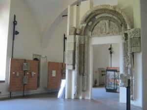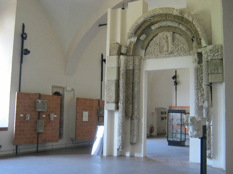 - NOTIZIE STORICO CRITICHE Il portale in arenaria con inserti in calcare chiaro ed esuberante corredo scultoreo, proviene dalla perduta cattedrale romanica estiva di S. Stefano. La stratificazione di piani con rigoglioso partito decorativo, a palmette, tralci ondulati, motivi fitomorfi, nastri intrecciati, girali, figure zoomorfe, lotte tra mostri, figure umane, costituisce la sigla distintiva e peculiare dei portali pavesi tra XI e XII secolo. \nI motivi decorativi, apparentemente distribuiti in modo casuale, rivelano in realtà un'attenzione compositiva e una ben studiata ricercatezza e varietà formale, l'alternanza dei materiali impiegati, calcare e arenaria, non consueta in ambito pavese, conferisce un ulteriore arricchimento cromatico al partito decorativo. I capitelli sul quale si imposta l'archivolto sono di calcare, di scarso aggetto, con motivi figurativi zoomorfi e vegetali che spesso sembrano fondersi con gli elementi decorativi delle cordonature, quasi senza soluzione di continuità. La lunetta con l'angelo, più aggettante rispetto ai rilievi dei pennacchi laterali curvilinei, è strutturalmente indipendente.Nella lunetta la figura dell'arcangelo ieratico, tipico della produzione bizantina, scolpito all'interno dell'edicola, mostra affinità tipologiche con quelli di S. Michele e S. Giovanni in Borgo, ma soprattutto con l'angelo nel timpano del portale di S. Pietro in Ciel d'Oro. L'angelo, mediatore tra Dio onnipotente e l'uomo, è frequentemente collocato all'interno della lunetta dei portali, sopra la porta di forma quadrangolare, simbolo della materialità e sotto l'archivolto semicircolare, simbolo della volta celeste (il timpano di S. Pietro in Ciel d'Oro allude alla realtà spirituale). Il portale è una componente essenziale della chiesa romanica che è intrisa di valori simbolici, in particolare la decorazione ad esso riservata, è un fatto nuovo propriamente romanico. Dalla porta, che ha un valore sacro, prende avvio la cerimonia della consacrazione dell'edificio chiesastico, "la chiesa inizia ad esistere solo quando il vescovo ha consacrato la porta" e nei testi biblici Cristo si identifica con la porta, da qui l'uso di un partito decorativo assai ricco destinato all'ingresso. L'angelo, talvolta il leone, scolpiti sulla soglia, romanica manifestano l'idea di controllo e di difesa dell'ingresso, di purificazione e redenzione prima di accedere all'interno. I tralci con volatili alludono all'umanità da redimere, è inoltre evidente il richiamo all'albero cosmico della Bibbia, di altezza vertiginosa, ricco di frutti e popolato da uccelli e da altri animali.\nLa vivacità creativa dei lapicidi pavesi è percepibile nella varietà dei motivi decorativi sapientemente esibiti. L'apparato ornamentale del portale è consapevolmente desunto dalla tradizione, dal repertorio scultoreo di origine tardo antica e altomedievale.Nelle campiture laterali della lunetta la coppia di colombe affiancate al calice e l'albero della vita, con il piegarsi un po' forzato dei racemi a seguire la curvatura, hanno origini paleocristiane. L'incorniciatura architettonica attorno all'arcangelo è mutuata dall'arte carolingia, i nastri intrecciati e i riempimenti forzati, una sorta di "horror vacui" rimandano ai "barbarismi" medievali". Rispondenze si riscontrano anche con gli splendidi decori dei tessuti orientali, i cui motivi sono frequenti nelle campiture di transenne e lastre altomedievali, come nel pluteo istoriato con l'albero della vita tra draghi affrontati e a quello con pavoni che si abbeverano ad un cantharos (della prima metà del sec. VIII).\nMa il lessico decorativo altomedievale viene riformulato e modernizzato, con la ricerca della "varietas" e con il cosiddetto "intreccio astrattizzante". Il motivo iconografico nella lunetta con volatili appollaiati su racemi, si ritrova analogo in un capitello della spalla sinistra, ma lo stesso soggetto compare anche in una formella scolpita proveniente da S. Maria del Popolo (inv. B 67, sala VII), ciò ha fatto pensare ad un'identità esecutiva e cronologica e ha confermato lo stretto rapporto, i rimandi, formali e non solo, e la complementarietà tra le due cattedrali gemine romaniche di S.Stefano e S.Maria del Popolo. \nIl partito decorativo, che denuncia una qualità tecnica elevata, un 'ductus' raffinato e sicuro (più incerto nella lunetta) e una forma matura, consente di datare il portale agli inizi XII secolo.