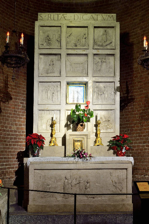 - NOTIZIE STORICO CRITICHE L'absidiola destra della basilica romanica di S. Pietro in Ciel d'Oro (precedentemente di patronato della famiglia Fiamberti), ospita l'altare dedicato a S. Rita da Cascia (1381-1457 d.C.), Santa agostiniana degli impossibili, nata nell'anno 1381 a Roccaporena, nel comune di Cascia. La cappella rappresenta un punto di forte richiamo per molti fedeli, perché custodisce (in un reliquiario moderno in vetro) una reliquia di una Santa particolarmente venerata dai pavesi e non solo, il cui culto è stato portato in città dalla comunità degli Agostiniani che regge la basilica dal 1327.\nAnnualmente il 22 maggio si celebra la festa di S. Rita, giornata che assume aspetti popolari e folcloristici, coinvolgendo l'intero quartiere nell'organizzazione della tradizionale fiera, caratterizzata in particolare dalla vendita delle rose benedette, legate al culto molto sentito della Santa. Il 22 dicembre 1933 Agostino Calcagno, Padre Provinciale dell'Ordine Agostiniano, invia una lettera alla Soprintendenza all'Arte Medievale e Moderna della Lombardia (prof. Gino Chierici) con la specifica richiesta di poter rinnovare l'altare di S. Rita che appare ormai obsoleto e scadente "per l'eccessiva semplicità del disegno e per la povertà dei materiali". Il vecchio altare, che risale al 1804, consiste in un'ossatura lignea ricoperta di scagliola di marmo con un apparato decorativo estremamente semplificato a disegni geometrici bianchi e neri, è completato dal piccolo quadro con l'estasi della Santa entro una cornice barocca dorata. Alla Soprintendenza vengono presentati due progetti, uno dell'architetto milanese Valfredo Vizzotto, con una profusione di marmi grigi, gialli, rossi e bianchi che conserva al centro dell'altare il quadretto con l'immagine di S. Rita e uno del pittore pavese Antonio Villa (1883-1962) per la decorazione affrescata del catino absidale. Le due elaborazioni, più una seconda sempre del Villa presentata il 12 febbraio 1937, che però non vengono approvate perché ritenute inadeguate alla importanza e "monumentalità" della basilica. Bisogna attendere sino al 12 maggio 1938, quando l'architetto pavese Emilio Carlo Aschieri, scrivendo al Padre Provinciale di aver ricevuto l'incarico per il prestigioso altare (ma non sono ben chiari gli accordi intercorsi tra le due parti), invia una relazione accompagnata da alcuni disegni, in cui specifica che l'altare sarà staccato dalla parete in modo da non sia intaccare la cappella, sia il mosaico pavimentale antistante. Presso l'Archivio dei Padri Agostiniani si conservano alcuni progetti del 1938 dell'Aschieri per l'altare e nel Fondo fotografico Guglielmo Chiolini ai Musei Civici alcune lastre in vetro con i rilievi commissionate dall'architetto pavese. Il 24 giugno 1938 l'Aschieri spedisce una lettera con allegato il preventivo dello scultore pavese Giovanni Scapolla per l'esecuzione dell'altare (la cifra viene notevolmente ribassata perché l'artista tiene a questo lavoro in modo particolare). Scapolla attende alla prestigiosa committenza, destinata ad una tra le più importanti basiliche cittadine e che ospita un capolavoro come l'arca marmorea di S. Agostino, dal 1938 al 1939. Nel 1940 l'altare è inaugurato e ricordato sulla stampa locale "per la sua preziosità".\nLa pala d'altare e il paliotto in marmo con vari episodi della vita di S. Rita, viene infatti eseguita da Giovanni Scapolla su disegno di Emilio Carlo Aschieri, cui è affidata la direzione artistica, assieme a Gino Chierici, Soprintendente all'Arte Medievale e Moderna della Lombardia, che suggerisce lievi modifiche. L'architetto progetta l'intero monumento e anche il programma iconografico, in cui un gradino continuo di serizzo grigio, regge il paliotto sul quale si imposta la pala marmorea con 11 pannelli figurativi, legati alla storia della Santa.\nNell'Archivio dei Padri Agostiniani si conserva un'immagine fotografica con un modellino della pala di Scapolla che presenta molte varianti rispetto a quello attuato, sia nei soggetti delle formelle, in cui le figure e le architetture nello sfondo denunciano un maggior rilievo, sia nell'inserimento al centro di una formella marmorea con il busto di S. Rita, invece del quadretto policromo dipinto dal pittore romano Tito Troja (1847-1916), raffigurante S. Rita in estasi che riceve da Cristo crocifisso la spina sulla fronte entro una cornice barocca in legno dorato.