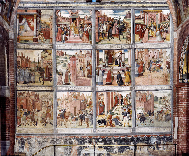 Ciclo con le storie della vita di S. Teodoro, titolare della chiesa, dall'elezione a Vescovo di Pavia dal 740-769, sino alla morte e ai funerali officiati da Papa Leone il 20 maggio 778. Consta di quindici riquadri, dei quali due affrescati sulle pareti laterali; ogni episodio è corredato da didascalie in volgare, dipinte entro un cartiglio appeso ad un finto architrave marmoreo. Per la lettura si parte dal primo riquadro in alto a sinistra del registro superiore: Un angelo appare a re longobardo Desiderio e gli suggerisce il nome di Teodoro a nuovo vescovo di Pavia; Elezione di Teodoro a vescovo, alla presenza del re, in trono, che riunisce popolo e clero; Teodoro si reca a Roma per ricevere la consacrazione all'episcopato e nel tragitto effettua guarigioni; Papa Leone IV lo conferma vescovo; Ritorno da Roma a Pavia, accolto dal clero; Il Santo fa passare una vedova sul Ticino e guarisce il figlio paralitico; Riattacca la mano ad un giudeo e lo battezza; Teodoro respinge l'esercito Franco, entrato in città con l'aiuto della figlia di Desiderio; Il Santo difende Pavia dall'assedio dei franchi; Il nipote di re Carlo Magno volendo colpire S. Teodoro è ucciso dalla sua stessa freccia; Il Santo resuscita il giovane principe; Le acque del Ticino sommergono l'accampamento francese.