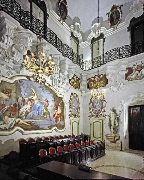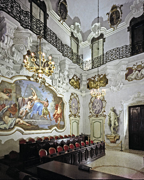 - NOTIZIE STORICO CRITICHE Il progetto del più prestigioso palazzo cittadino, capolavoro del barocchetto lombardo e dimora della nobile famiglia Mezzabarba (attuale sede del Comune di Pavia) si deve al celebre architetto pavese Giovanni Antonio Veneroni, ingegnere e architetto della Regia Casa e agrimensore al servizio del collegio Borromeo e di grandi proprietari terrieri, che lo realizza tra il 1726 e il 1732.\nQuasi contemporaneamente, nel lasso di tempo tra il 1728 e il 1732, i fratelli Giuseppe e Girolamo Mezzabarba commissionano anche l'intero e fastoso partito decorativo, ultimato nel 1737 (data riportata entro un cartiglio), dei prestigiosi ambienti di rappresentanza, destinati ad ospitare le raccolte d'arte precedentemente collocate nella dimora milanese dei Mezzabarba. La residenza patrizia, come in uso nel XVIII secolo presso la nobiltà, viene mirabilmente decorata da una equipe di maestranze qualificate, quadraturisti, specialisti di paesaggio, prospettive e di ornati floreali, al seguito di uno stimato pittore di figura che conferisce lustro al palazzo, con un complesso partito decorativo caratterizzato da scene figurate celebrative a soggetto biblico (storie dell'Antico Testamento), mitologico (episodi dell'Eneide e dell'Iliade) e allegorico (Sapienza, Virtù, Arti), completate da serti di fiori ariosi e leggiadri, sfondi paesaggistici con rovine e marine, imponenti statue a monocromo 'trompe l'oeil'. Il programma iconografico degli affreschi, ad oggi non completamente chiarito, ma aggiornato alle novità del rococò, esibisce una cromia chiara e luminosa, una pennellata veloce e vivace, leggerezza compositiva, stile e iconografie 'galanti', testimoniando la cultura raffinata ed erudita dei committenti Mezzabarba, oltre al "loro alto senso morale e rifiuto di ogni temerarietà e dissipatezza". La 'guida' del 1777 redatta dallo storico locale Francesco Bartoli, consente l'attribuzione di alcune notevoli medaglie affrescate al celebre maestro cremonese Giovan Angelo Borroni, illustre esponente dello stile rococò e vero protagonista della pittura lombarda del Settecento, che gode di ampia considerazione nell'ambiente dell'aristocrazia pavese e milanese. In particolare l'ampio successo derivatogli dal partito decorativo affrescato in palazzo Mezzabarba gli porterà numerose altre committenze da parte delle famiglie patrizie locali, quali Giorgi, Bellisomi, Olevano, Botta e anche nel palazzo Vescovile. Giovan Angelo Borroni nasce a Cremona nel 1684 e avviato alla pittura secondo G.B. Zaist, suo principale biografo, presso il quadraturista di Giuseppe Natali (1652-1722), frequenta in seguito la bottega del figurista Roberto De Longe (1645-1709), quindi lo studio più prestigioso di Cremona, di Angelo Massarotti (1654-1723). Con l'appoggio del mecenate conte Giuseppe Angelo Crivelli si trasferisce a Bologna per perfezionarsi ed entra in contatto con Marcantonio Franceschini, Giovan Gioseffo Dal Sole e Francesco Monti. Rientrato a Cremona, nel 1730 a seguito della morte della moglie si trasferisce a Milano, dove inizia il periodo delle numerose committenze da parte della nobiltà lombarda. Muore a Milano nel 1772. Al periodo non cremonese, legato al trasferimento a Milano e alle committenze aristocratiche del capoluogo, vanno ascritti gli affreschi del Mezzabarba che probabilmente esegue con aiuti dal 1728 al 1732, dal momento che nel 1733 torna temporaneamente a Cremona intervenendo sui deteriorati affreschi di Giulio Campi, nella chiesa di S. Margherita. Bossaglia individua due prestigiosi collaboratori di Borroni, attivi in palazzo Mezzabarba, il pittore milanese Felice Biella, specializzato in spettacolari architetture prospettiche e scenografiche e il comasco Giuseppe Coduri detto il Vignoli, riconoscendo un tono conduriano ad alcune quadrature a finto stucco, "dalle molli cornici tutte virgolate, aperte come a contenere specchi, dolcemente scarne in una edizione preziosa di rocaille". Nella volta del palazzo pavese è affrescata la grande medaglia con 'La Sapienza e la Virtù trionfano sul Vizio' e sulle pareti est e ovest il ciclo narrativo, tratto dalle Metamorfosi di Ovidio, con le 'Favole di Diana', giudicato il suo capolavoro e tra le opere più briose e gradevoli di tutto il Settecento lombardo. \nLa ricca decorazione della sala, interamente percorsa dal ballatoio per i musici sorretto da mensoloni accartocciati e con balaustra in ferro battuto, viene completata ai lati dell'ingresso e della portafinestra, da quattro finte statue marmoree, a monocromo bianco-grigio, di Divinità: Mercurio, Dionisio, Ercole, Minerva; nelle sovrapporte da sei figure mitologiche entro ovali: Saturno, Apollo, Venere, Marte, Giunone e Giove, nelle specchiature da satiri, ninfe e raffigurazioni di fiumi, quindi da angioletti a figura intera entro ovali, eseguiti dagli aiuti dell'atelier del Borroni. Lo Zaist, suo principale biografo parla di fiumi "che sembran di mano dei Carracci".