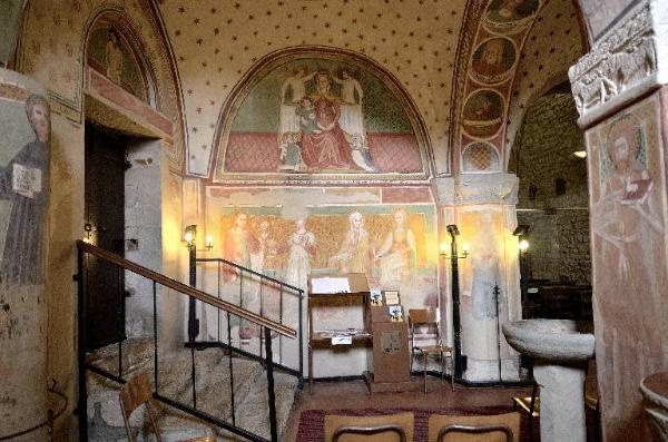 Nella chiesa dedicata al fondatore, si conserva l'affresco di maggior rilievo storico, "Il miracolo di S. Alberto" del XV secolo che raffigura l'evento straordinario successo davanti a Papa Alessandro II, al centro di una mensa imbandita, tra cardinali: l'abate Alberto, in piedi in abito nero, mitra e pastorale, tende la mano per benedire l'acqua che miracolosamente si trasforma in vino; completano l'affresco il pozzo dell'Abbazia dipinto in basso a destra e l'iscrizione sottostante a caratteri gotici. S. Alberto accusato ingiustamente di essersi comunicato sacrilego si recò a Roma alla mensa del Papa, attuando il miracolo raffigurato nell'affresco. Notevole per l'esecuzione e la grazia la "Madonna col Bambino in trono" affiancata dalle Sante Apollonia e Lucia e dai Santi Antonio e Alberto, a grandezza naturale, quindi dal committente (forse il marchese Bertramino Malaspina di Sagliano), tradizionalmente più piccolo e in ginocchio, mentre offre alla Vergine il suo berretto in segno di devozione. La chiesa di S. Antonio appare quasi interamente decorata da un vivace e prezioso partito decorativo ad affresco che si distende su pareti, volte, pilastri e sottarchi.