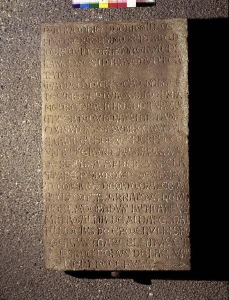 - NOTIZIE STORICO CRITICHE La lapide era murata sul pilone centrale di Porta Romana. La Porta era il primo e più rappresentativo degli ingressi eretti nella cinta difensiva di Milano iniziata nel 1171, a quattro anni dal rientro dei milanesi dall'esilio decretato da Federico Barbarossa dopo l'assedio e la distruzione del centro nel 1162. Nella lapide i consoli rievocavano il rientro dei milanesi in città il 5 magio 1167 e ne celebravano la rinascita con la costruzione della porta iniziata l'1 marzo 1171. La Porta sopravvive fino al 1793 quando viene abbattuta per essere sostituita da un edificio progettato da Leopoldo Pollack, sul quale vengono murati i rilievi superstiti di due dei tre piloni, fino al loro trasferimento al Castello, nel 1895.