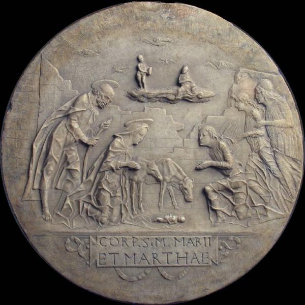 - NOTIZIE STORICO CRITICHE Il rilievo faceva parte della perduta Arca dei Martiri Persiani, Mario, Marta, Audiface e Abacone, in San Lorenzo a Cremona, originariamente commissionata nel marzo 1479 a Giovanni Antonio Piatti dall'abate Antonio Meli. Deceduti entrambi in breve tempo, gli eredi stipularono un nuovo contratto con l'Amadeo che termina l'opera nel 1482. Alla soppressione della chiesa, segue la demolizione dell'Arca. I numerosi marmi che la componevano vengono acquistati dalla Cattedrale di Cremona nel 1805. Alcune parti entrano nella collezione di Giuseppe Picenardi presidente della Fabbriceria, tra queste la Natività del Castello e il pendant con l'Annunciazione ora al Louvre. I pezzi della collezione Picenardi andarono infatti dispersi sul mercato antiquario senza conservare la memoria della destinazione originaria. Il tondo, insieme con una settantina di opere, giunge nel 1868 al Museo Patrio dalla collezione della "Villa detta le Torri de'Picenardi" nel territorio cremonese. L'autore del tondo è stato individuato in una personalità autonoma, rispetto a Piatti e Amadeo, identificato con il Maestro della Natività del Castello. (Zani, 2013)