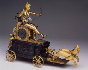 La cassa di questo orologio, noto come Il carro di Diana, ha la forma di una carro trionfale in ebano, con le ruote in bronzo dorato e fregi d¿argento. Diana, la dea della caccia, è seduta sul trono nell¿atto di scoccare una freccia; due pantere tirano il carro mentre dietro il trono siede una scimmietta. Ai lati del trono sono incassati due quadranti d¿argento, uno per le ore e uno per attivare la suoneria, decorati con smalti policromi con fiori e uccelli. Grazie ad una molla interna le ruote del carro girano, le due pantere si alzano e si abbassano simulando i balzi di una corsa e le loro teste ruotano, così come gli occhi di Diana e la testa della scimmietta.