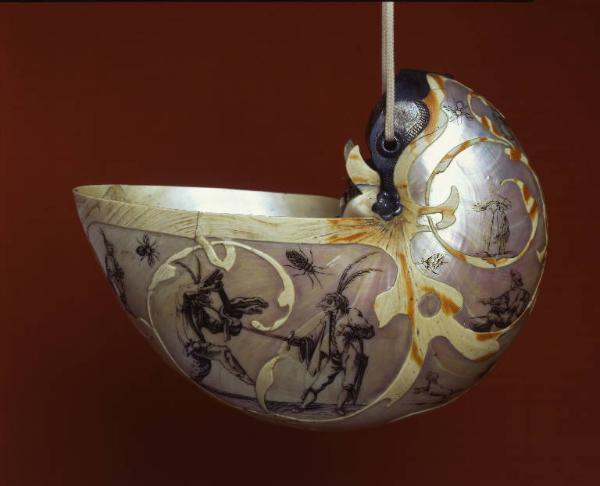 - NOTIZIE STORICO CRITICHE Le caratteristiche naturali della conchiglia di Nautilus pompilius sono qui impiegate con maestria per ottenere un manufatto di grande complessità esecutiva e raffinata eleganza. I personaggi di Callot rappresentati sulla conchiglia sono liberamente ripresi dalle incisioni della serie Balli di Sfessania (1621-22): in particolare su un lato si trovano Taglia Cantoni e Gian Farina che duellano, sull'altro si fronteggiano Franca Trippa e Capitan Zerbino. L'intaglio a giorno dei setti interni della spirale si presta naturalmente alla rappresentazione di un elmo con la celata abbassata, creando l'alloggiamento ideale per elementi decorativi di tipo araldico: uno scudo d'argento con fascia appoggiato all'aquila bicipite e sormontato da una corona principesca a gigli e fioroni. L'aquila è ricavata da un setto del Nautilus nonché incisa e rilevata in inchiostro; la corona è riportata a bulino sulla montatura d'argento. La presenza di api, farfalle, mosche, libellule e ragni costituisce un ulteriore richiamo al mondo naturale, a cui gli stessi personaggi di Callot non sono del tutto estranei con la loro fisionomia grottesca che ricorda mostruosi e giganteschi insetti. Le rimanenti figure sono riprese da altre serie dello stesso autore, riconducibili al 1635. In merito all'insegna araldica, l'ipotesi più suggestiva è che si tratti dello stemma di un imperatore del Sacro Romano Impero della casa d'Asburgo, forse Ferdinando III d'Asburgo(1637-1657). Nel 1968 van Seters ha proposto l'identificazione dello stemma con quello della città olandese di Groningen. Nel suo stato attuale lo scudo applicato al centro del setto non contiene indicazioni valide sui colori araldici, forse originariamente realizzati a smalto e poi andati perduti. La presenza di un elemento araldico esterno come una corona dei principi del sangue costituisce un'altra apparente incongruenza; probabilmente si tratta di un'aggiunta posteriore e quindi riconducibile a un successivo proprietario. La conchiglia compare in una tavola dell'album fotografico degli oggetti presenti all'Esposizione storica d'arte industriale in Milano del 1874; nel catalogo delle fotografie dell'esposizione, edito nel 1875, è riportata la dicitura "Conchiglia incisa e guernita in argento. - Secolo XVI. - Al vero. (P. Poldi Pezzoli nob. G.G.)", mentre nel catalogo dell'esposizione del 1874 è presente, nella sezione delle oreficerie, una "Conchiglia scolpita - secolo XVI Trotti Me Lodovico". È quindi possibile che l'oggetto sia entrato nella collezione di Poldi Pezzoli subito dopo l'esposizione del 1874, sebbene non si trovi una voce specifica relativa a tale acquisizione nel Libro dei conti del nobiluomo per gli anni 1874 e 1875. Il valore dell'oggetto indicato nell'inventario successivo alla morte di Gian Giacomo Poldi Pezzoli (1879) è di lire 500. Forse l'interesse di Poldi Pezzoli per questo singolare oggetto è anche da ricondursi alla presenza nella collezione di Manfredo Settala di numerose conchiglie di Nautilus, tuttora conservate presso la Pinacoteca Ambrosiana, alcune montate su piedistalli, altre libere da sovrastrutture metalliche, di lavorazione italiana, europea o orientale; in quasi tutti i casi le conchiglie recano interventi decorativi volti a esaltarne le caratteristiche naturali (la peculiare forma, il contrasto tra l'opacità e l'iridescenza delle superfici, lo sviluppo progressivo della spirale) e a sfruttare le possibilità compositive offerte dall'intaglio dei setti. La fascinazione per il Nautilus pompilius a partire dalla fine del XVI secolo è anche da attribuirsi alla scoperta che la crescita della sua spirale è regolata da una precisa legge matematica, quella progressione logaritmica definita in seguito dal matematico svizzero Jacob Bernoulli Spira mirabilis. Van Veters (1968) accosta quest'opera ad altre tre conchiglie di Nautilus. Con la fondazione della Compagnia olandese delle Indie orientali all'inizio del Seicento le conchiglie di Nautilus pompilius trovarono nei porti olandesi un punto d'accesso al mercato europeo; in particolare ad Amsterdam la bottega dei Bellekin si specializzò nella decorazione di conchiglie di Nautilus con scene di genere ed elementi naturalistici. Nel catalogo del Museo Poldi Pezzoli del 1981 la conchiglia, priva di marchi o iscrizioni, viene assegnata all'incisore di madreperla Cornelius Bellekin, seguendo l'ipotesi suggerita da Lipinsky nel 1977; nel 1968 van Veters propose, insieme a quello di Bellekin e comunque in forma dubitativa, il nome dell'incisore boemo Wenzel Hollar, presente ad Anversa e nei Paesi Bassi tra gli anni quaranta e cinquanta del XVII secolo, autore di una serie di vedute di città olandesi, tra cui quella di Kampen. Mette, nel 1995, dubbioso sull'attribuzione a Bellekin è propenso ad assegnarlo, sulla base del repertorio decorativo callottiano, agli anni quaranta e cinqunata del XVII secolo. (Bosio, 2013)