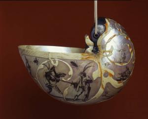 Lo strato esterno della superficie della conchiglia, opaco e striato, è stato selettivamente rimosso per creare racemi fitomorfi che delimitano campiture dal biancore madreperlaceo e traslucido su cui sono rappresentati personaggi incisi e rilevati con inchiostro, tratti dalle stampe di Jacques Callot, insieme a insetti, ragni e altre invenzioni. La spirale è tagliata in corrispondenza dell'apertura della conchiglia, mettendo in evidenza i setti interni, mirabilmente intagliati e incisi, su cui è applicato un piccolo scudo d'argento; il bordo della sezione è rifinito con una fascia d'argento incisa a bulino, dotata di fori e rosette per il passaggio della corda utilizzata per appendere ed esporre l'oggetto. L'intaglio a giorno dei setti interni della spirale si presta naturalmente alla rappresentazione di un elmo con la celata abbassata, creando l'alloggiamento ideale per elementi decorativi di tipo araldico: uno scudo d'argento con fascia appoggiato all'aquila bicipite e sormontato da una corona principesca a gigli e fioroni. L'aquila è ricavata da un setto del Nautilus nonché incisa e rilevata in inchiostro; la corona è riportata a bulino sulla montatura d'argento.