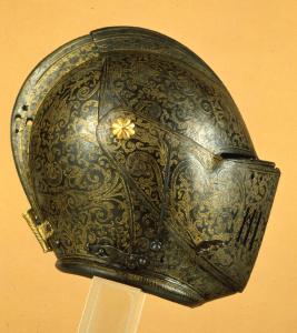 Elmo in acciaio bronzato nella superficie e coperto di una decorazione a racemi incisi e dorati. Vi compare più volte l'impresa crescente con il motto "SIC".