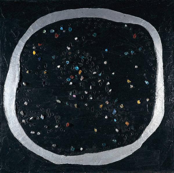 Tela dipinta d olio con applicazione di frammenti di vetro.
