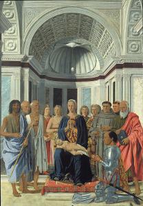 Pala Montefeltro. Pala di San Bernardino. Madonna con Bambino in trono con San Giovanni Battista, San Bernardino, San Girolamo, San Giovanni Evangelista, San Pietro Martire, San Francesco d'Assisi, Federico da Montefeltro e quattro angeli