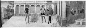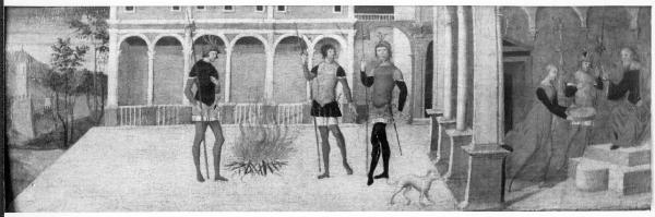 - NOTIZIE STORICO CRITICHE La vicenda raffigurata è tratta dalla Naturalis Historia di Plinio (XXVIII, 12) e ripresa nei Factorum et Dictorum Memorabilium di Valerio Massimo (VIII, I, 5, absol.)\nL'ordalia cui volle sottoporsi la vestale Tuccia è ambientata entro un loggiato aperto su una piazza urbica, al centro della quale tre soldati, dopo aver acceso il fuoco, attendono l'esito della prova. Sulla sinistra, a delimitare questo proscenio, uno squarcio di campagna con un castello e una torre. Questa dimensione cittadina che ricorda la veronese piazza dei Signori, utilizzata più volte da Nicola Giolfino quale fondale di alcuni suoi dipinti, come il Muzio Scevola tiene la mano nel braciere al cospetto di Porsenna, già Sotheby's, Londra, 14 febbraio 1968, lot. 53, e la predella con Storie di santa Barbara del Museo di Castelvecchio a Verona, inv. 937-1B1577, 938-1B1577. \nLa ragionevolissima attribuzione a Nicola Giolfino è stata avanzata per la prima volta da Bernard Berenson (1932, ed. cit. 1936, p. 199), che con le sue liste ha avuto in generale il merito di dare per primo una fisionomia sicura all'attività artistica del pittore veronese, in seguito approfondita e precisata da Marina Repetto Contaldo (1974, 1976) in numerosi contributi.\nLe figure rigide e la tavolozza assai semplice, giocata sull'alternanza dei gialli e dei rossi nella resa delle armature dei soldati, richiamano in tutto e per tutto la tradizione veronese della "pittura di cassone", un fenomeno artistico tutto locale e sostanzialmente isolato nel panorama figurativo dell'Italia settentrionale. Se il riferimento più prossimo resta ancora oggi il nome di Nicola Giolfino, il mondo stilistico entro cui è stata realizzata questa tavoletta risente senza dubbio della vasta produzione della bottega di Domenico Morone (Verona, 1442 circa - post 1517), nella quale mosse i suoi primi passi anche il figlio Francesco (Verona, 1471 circa - 1529) se, come penso, è lui da giovane l'autore dei due dipinti con Storie di Attilio Regolo conservati al Museo di Castelvecchio (inv. 685-1B825; 684-1B824).\nM. Vinco\n\nNella sua monografia (Vinco 2018) lo studioso sposta il riferimento alla bottega di Giolfino\nMarco Albertario