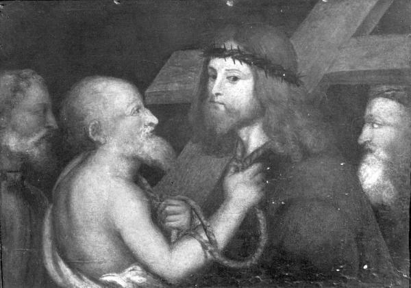 - NOTIZIE STORICO CRITICHE Nella prima guida dell'Accademia, pubblicata nel 1828, il conte Luigi Tadini non riconobbe la derivazione dall'originale Tizianesco, e preferì attribuire la tavola a Bernardino Luini: un riferimento che faceva leva sulla fisionomia dei carnefici nei quali riconosceva tracce dei "moti dell'animo" di ascendenza leonardesca. Probabilmente il conte Tadini, che acquistò il dipinto a Venezia, non era stato in grado di leggere l'iscrizione ben visibile nella parte posteriore. Si tratta di una antica iscrizione tracciata a pennello: "Quadro di Tiziano dato in dono al sig[nor] Don Pietro Contarini di Venezia l'anno 166[.] li 4 agosto.". Si tratta di un dato importante, perchè attesta che l'opera era ritenuta di Tiziano, e suggerisce anche una datazione intorno alla metà del XVII secolo.\nM. Albertario