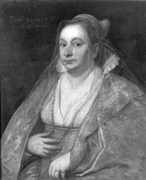 - NOTIZIE STORICO CRITICHE Acquistato dal conte Luigi Tadini unitamente al n.107 con il quale è in coppia come opera di G. Tintoretto.\n\nIl personaggio ritratto nel dipinto, in coppia con il n. P 107, è stato tradizionalmente identificato con la dogaressa Contarini ma va sicuramente riconosciuta, anche a seguito della corretta individuazione dell'identità del marito, Marino Grimani, con Morosina Morosini. Marino Grimani (1532 - 1605) fu incoronato doge di Venezia il 26 aprile 1595, e rimase in carica sino alla morte; la moglie Morosina Morosini (1545 - 1614) , in carica dal 1595, fu incoronata nel 1597 e mantenne il titolo fino alla morte del marito nel 1605. \nDella coppia si conoscono una serie di ritratti, che vedono impegnati i principali pittori veneziani in un costante gioco di originali e repliche. Risale probabilmente a quel periodo la coppia di ritratti realizzata da Leandro Bassano, 1597 (Dresda, Gemaldegalerie). Le insegne del suo rango erano il manto dorato e una piccola corona simile al Corno Ducale.\n(Monica Ibsen)