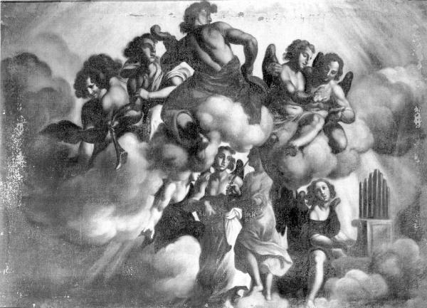 - NOTIZIE STORICO CRITICHE Il dipinto appartiene ad un nucleo di 10 opere acquistate dal conte Tadini presso l' "indorador in Santa Maria in Chiavica" a una data sicuramente post 1809, ed è registrato come "Una gloria di angeli che suonano, e cantano. Scuola dell'Orbetto. L. 3 10". \nSuccessivamente, è registrato tra le opere esposte nel palazzo Tadini di Crema ( Descrizione dei quadri esistenti nella Galleria Tadini in Crema, ms, 1817 ante) "11. Una gloria d'angeli che suonano, e cantano. Scuola dell'Orbetto di Verona."\nDopo il trasferimento della Galleria a Lovere la fortuna del dipinto si sviluppa attraverso questi testi: \n"337. Una gloria di Angeli che suonano e cantano. Scuola dell'Orbetto da Verona." (L. Tadini, 1828, p. 59 n. 337; L. Tadini 1837, p. 79 n. 337);\n\nL'inventario giudiziale del 1829 cita in questo modo: \n"347. Altro quadro in tela quadrilungo con cornice dorata, rappresentante una gloria d'angeli che suonano e cantano."\nIl riferimento all'Orbetto sembrerebbe trovare conferma nella nuova edizione della guida: "Alessandro Turchi detto l'Orbetto. Una gloria di Angeli che suonano e cantano" (Catalogo 1903, p. 13 n. 66)\ne il giudizio è riportato da E. Scalzi (1929, p. 50 n. 66)\n"n. 66 - Alessandro Turchi detto l'Orbetto / Verona 1582-1648\nGloria di Angeli che suonano e cantano\nNella G[uida] V[ecchia] era assegnato alla: "Scuola dell'Orbetto". Il Frizzoni lo attribuì esplicitamente a tale autore."\nL'inventario della Pinacoteca riporta poi il parere orale di W. Arslan, che lo definì "Copia" dall'Orbetto.\nRitengo che il dipinto sia stato rimosso dall'esposizione negli anni '50: infatti, nell'inventario della Pinacoteca (del 1966) è registrato come esposto presso la Scuola di disegno, e non è citato in G. A. Scalzi, La Galleria Tadini, Lovere 1969.\nM. Albertario\n\nDavide Dossi (comunicazione scritta alla direzione della Galleria, 13/02/2013) suggerisce una relazione con la pala di Santa Maria Maddalena in San Tommaso Cantauriense, a Verona; allo stesso risultato è arrivato indipendentemente S. L'Occaso 2018: "Per l'Orbetto segnalo invece una tela del Museo Tadini di Lovere, inv. 66, in relazione con la pala di Santa Maria Maddalena in San Tommaso Cantauriense, a Verona". \nM. Albertario
