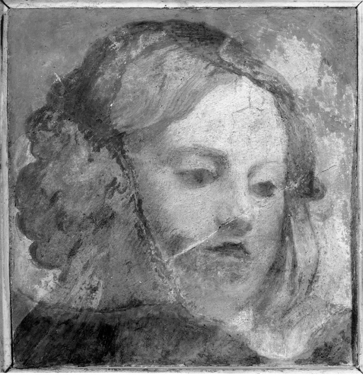- NOTIZIE STORICO CRITICHE I tre frammenti di intonaco staccati, probabilmente a massello (non è possibile valutare la parte posteriore) sono contenuto in tre cornici a cassetta di rilevante spessore (tra gli 8 e i 9,5 cm) chiuse nella parte posteriore da una tavoletta (spessore 1,5-2 cm). La tavoletta risulta ancora fissata alla cornice con il sigillo originale della collezione, apposto nel 1829 in occasione dell'Inventario giudiziale.\nI tre frammenti (H 521, H 522, H 523) provengono dalla cappella dell'Immacolata nella chiesa di San Francesco a Viadana, che presentava una "cupola dipinta a fresco per mano del Parmigianino". Nel 1815, in occasione della demolizione della chiesa "staccandone dal vólto l'intonaco". Furono staccati nel 1815 da Giuseppe Baruffaldi e donati al conte Luigi Tadini (così in A. Parazzi, Appendici alle Origini e Vicende di Viadana, Viadana 1894, pp. 85-91; p. 202-203). \nCirca il nome di Parmigianino, va detto che non sono citati nel testo che il conte Tadini poteva assumere come riferimento (Ireneo Affò, Vita del graziosissimo pittore Francesco Mazzola detto il Parmigianino, Venezia, 1783, pp. 23-24; un esemplare è presente nella biblioteca dell'Accademia Tadini). Il riferimento è stato ripreso da E. Fadda (2010). \nLa prima guida della Galleria (L. Tadini, Descrizione generale dello stabilimento dedicato alle belle arti in Lovere dal conte Luigi Tadini cremasco, Milano 1828, p. 71 A, B, C; 2° edizione Bergamo 1837, p. 107 n. A, B, C) infatti recita: "a, b, c, Tre teste di Cherubini dipinte a fresco, che esistevano nella cupola di una cappella della chiesa dei frati Francescani di Viadana, borgo della provincia di Mantova. Questa chiesa fu demolita, e questi sono i soli avanzi delle pitture di Correggio che ivi si trovavano, e che non senza stento si sono potute salvare." \nLa guida della pinacoteca è citata e contestata da Parazzi, che però mantiene il riferimento a Parmigianino e li dice provenienti dalla cappella dell'Immacolata nella chiesa di San Francesco. \nNessuna ulteriore informazione si ricava dai cataloghi manoscritti. \n\nIl riferimento a Parmigianino - con riserva - è ripreso da Fadda 2010, p. 14. La proposta in favore di Sisto Badalocchio formulata da Crispo 2016 trova conferma in un disegno, passato di recente sul mercato antiquario statunitense (Stair Hudson, NY, 26-27 ottobre 2019, lotto 363), che rappresenta una incoronazione della Vergine, ritenuto preparatorio per la composizione di Viadana dalla quale provengono i tre frammenti (Crispo 2020). \nMarco Albertario