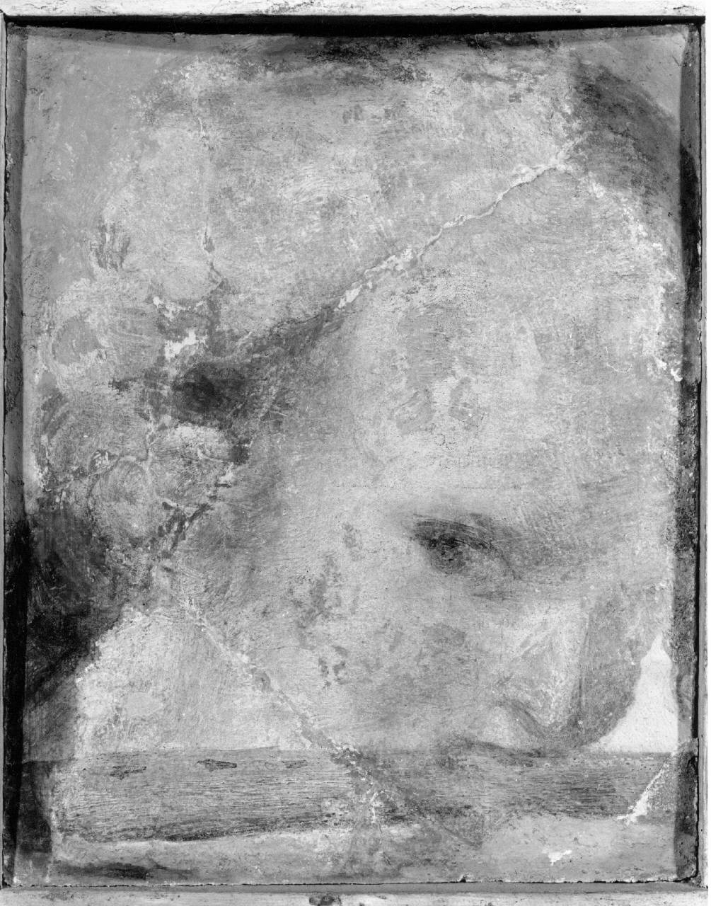 - NOTIZIE STORICO CRITICHE I tre frammenti di intonaco staccati, probabilmente a massello (non è possibile valutare la parte posteriore) sono contenuto in tre cornici a cassetta di rilevante spessore (tra gli 8 e i 9,5 cm) chiuse nella parte posteriore da una tavoletta (spessore 1,5-2 cm). La tavoletta risulta ancora fissata alla cornice con il sigillo originale della collezione, apposto nel 1829 in occasione dell'Inventario giudiziale.\nI tre frammenti (H 521, H 522, H 523) provengono dalla cappella dell'Immacolata nella chiesa di San Francesco a Viadana, che presentava una "cupola dipinta a fresco per mano del Parmigianino". Nel 1815, in occasione della demolizione della chiesa "staccandone dal vólto l'intonaco". Furono staccati nel 1815 da Giuseppe Baruffaldi e donati al conte Luigi Tadini (così in A. Parazzi, Appendici alle Origini e Vicende di Viadana, Viadana 1894, pp. 85-91; p. 202-203). \nCirca il nome di Parmigianino, va detto che non sono citati nel testo che il conte Tadini poteva assumere come riferimento (Ireneo Affò, Vita del graziosissimo pittore Francesco Mazzola detto il Parmigianino, Venezia, 1783, pp. 23-24; un esemplare è presente nella biblioteca dell'Accademia Tadini). Il riferimento è stato ripreso da E. Fadda (2010). \nLa prima guida della Galleria (L. Tadini, Descrizione generale dello stabilimento dedicato alle belle arti in Lovere dal conte Luigi Tadini cremasco, Milano 1828, p. 71 A, B, C; 2° edizione Bergamo 1837, p. 107 n. A, B, C) infatti recita: "a, b, c, Tre teste di Cherubini dipinte a fresco, che esistevano nella cupola di una cappella della chiesa dei frati Francescani di Viadana, borgo della provincia di Mantova. Questa chiesa fu demolita, e questi sono i soli avanzi delle pitture di Correggio che ivi si trovavano, e che non senza stento si sono potute salvare." \nLa guida della pinacoteca è citata e contestata da Parazzi, che però mantiene il riferimento a Parmigianino e li dice provenienti dalla cappella dell'Immacolata nella chiesa di San Francesco. \nNessuna ulteriore informazione si ricava dai cataloghi manoscritti. \n\nIl riferimento a Parmigianino - con riserva - è ripreso da Fadda 2010, p. 14. La proposta in favore di Sisto Badalocchio formulata da Crispo 2016 trova conferma in un disegno, passato di recente sul mercato antiquario statunitense (Stair Hudson, NY, 26-27 ottobre 2019, lotto 363), che rappresenta una incoronazione della Vergine, ritenuto preparatorio per la composizione di Viadana dalla quale provengono i tre frammenti (Crispo 2020). \nMarco Albertario